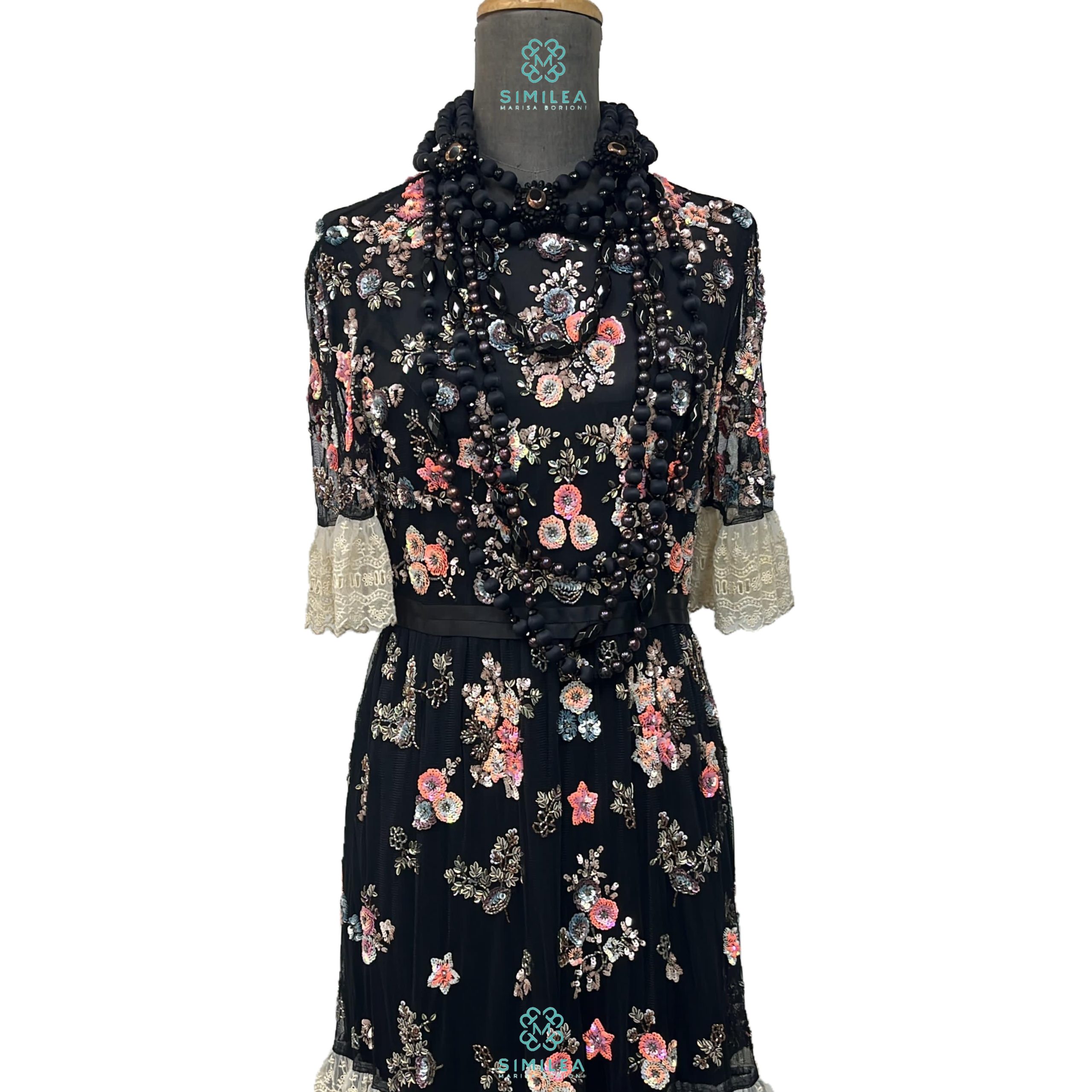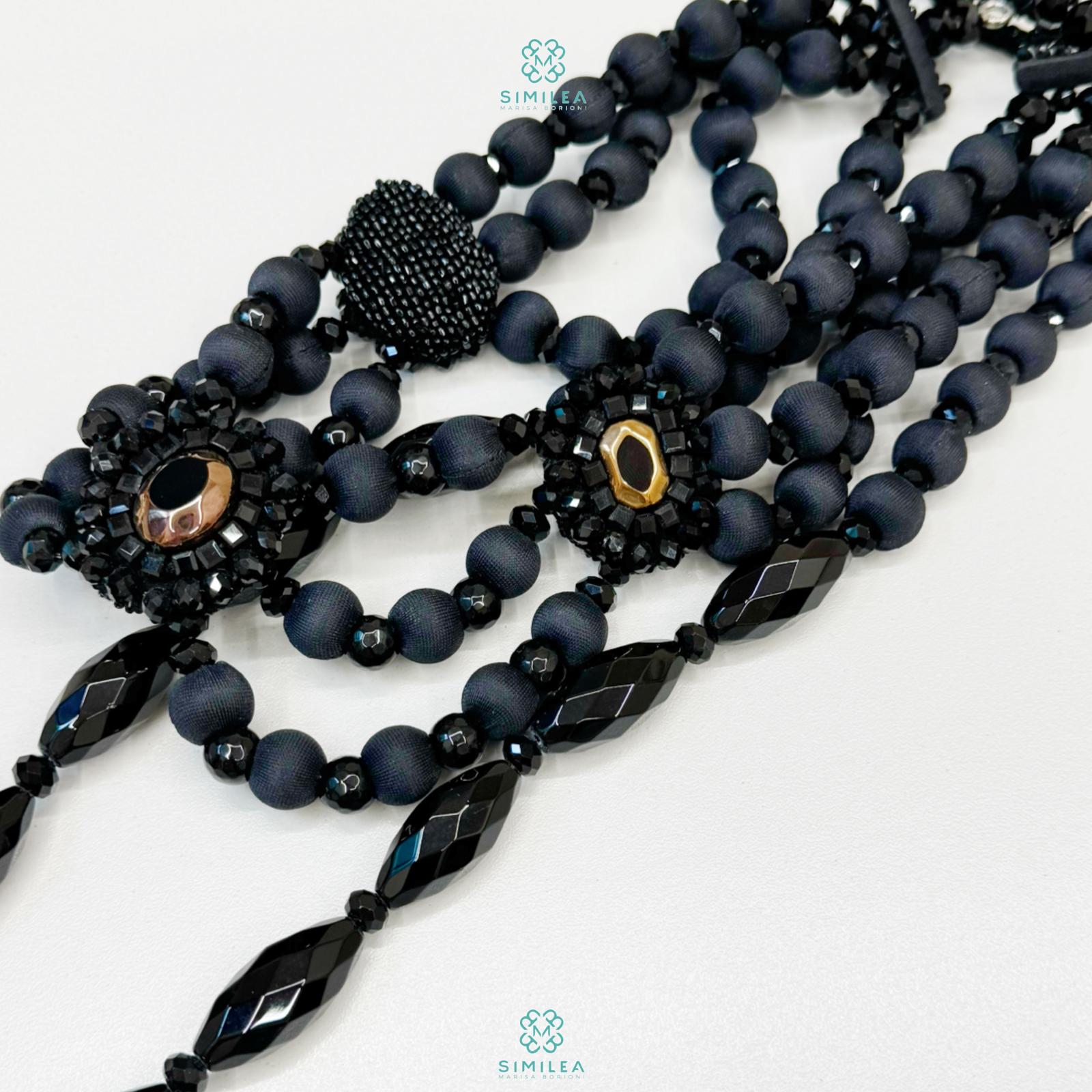 Collana con fili di sfere avvolte in seta, cristalli lucenti e perle nere. Decorato con tre placche frontali con ricamo cristalli dorati e perline.