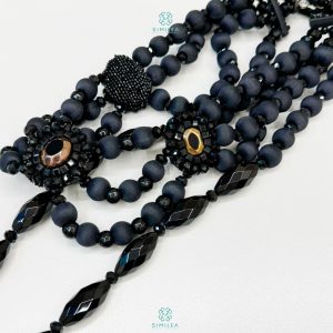 Più fili di sfere avvolte in seta scorrono come un manto fluido, morbido e regale. Tre gioielli ricamati, incastonati con pietre dorate e nere, raccolgono la composizione in un equilibrio perfetto. Intorno, cristalli minuti si muovono con leggerezza, mentre alla base, una fila di cristalli ovali — più grandi, scolpiti nella luce — chiude la struttura con eleganza solenne.